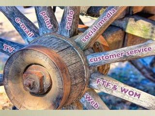 This document discusses integrated marketing communications (IMC) and the role of social media. It notes that IMC involves using a combination of communication tools as part of an overall marketing strategy. Social media is described as one "spoke" that can be used for brand awareness, customer service, and crisis communication. Several social media tools are listed, and examples of companies effectively using social media are provided. Challenges of social media include resources, research availability, and brand protection. The document concludes by discussing future skills needed for IMC, such as creativity and customer service orientation, and the importance of staying current by reading blogs, networking, and ongoing professional development.
