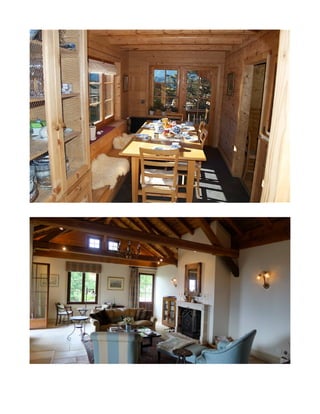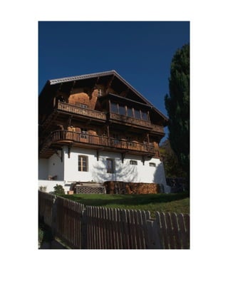 This chalet was built in 1906 in Villars-sur-Ollon, Switzerland and has been carefully restored while maintaining original features. It has 420 square meters of living space across four floors with views of Mont Blanc and the Dents du Midi mountains. The ground floor contains the kitchen, dining area, reception rooms with fireplaces, and covered parking. The first floor has the master bedroom, bathroom, and balcony.