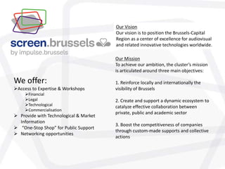 Our vision is to position Brussels as a center of excellence for audiovisual and innovative technologies worldwide. Our mission is to reinforce Brussels' visibility internationally, create an ecosystem for collaboration between public, private and academic sectors, and boost company competitiveness through tailored support and collective actions. We offer expertise, workshops, financing, legal and technological support, commercialization assistance, and networking opportunities to achieve this mission.