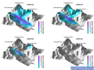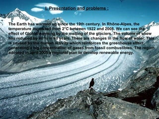 The document discusses the melting of glaciers and snow in the Alps due to global warming caused by human activity that enhances the greenhouse effect. It notes that temperatures have increased 2°C in the Rhône-Alpes region over the past century and glaciers have lost significant volume and length. Solutions proposed include developing renewable energy, reducing greenhouse gas emissions through fuels and vehicles, and international agreements like the Kyoto Protocol.