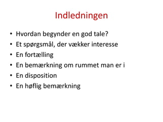 IndledningenHvordan begynder engod tale?Et spørgsmål, der vækker interesseEn fortællingEn bemærkning om rummet man er iEn dispositionEn høflig bemærkning