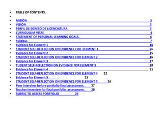 2. A table of contents listing the various sections and evidence included in the portfolio.