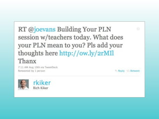 The document discusses using Twitter to build a personal learning network (PLN). It defines key Twitter terms and provides tips for getting started on Twitter. The document recommends identifying experts in your field to follow and expand your network by checking who they follow. It also suggests tweaking your PLN over time and maintaining it by sharing information with your network. Finally, it discusses using Twitter to find and land jobs by following certain accounts and hashtags.