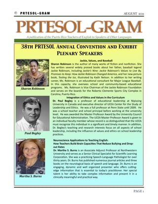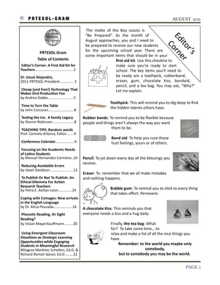 This document is the August 2011 issue of the PRTESOL-GRAM newsletter. It provides information on the upcoming 38th annual PRTESOL convention, including profiles of the plenary speakers: Sharon Robinson, Paul Begley, and Martha Burns. The newsletter also features articles on using technology to teach oral production, turning traditional teaching methods on their head, Sharon Robinson's book "Testing the Ice", teaching tips, an upcoming conference calendar, and focusing on Latino student needs. The editor's corner provides a "first aid kit" metaphor for teachers to be prepared for the new school year.
