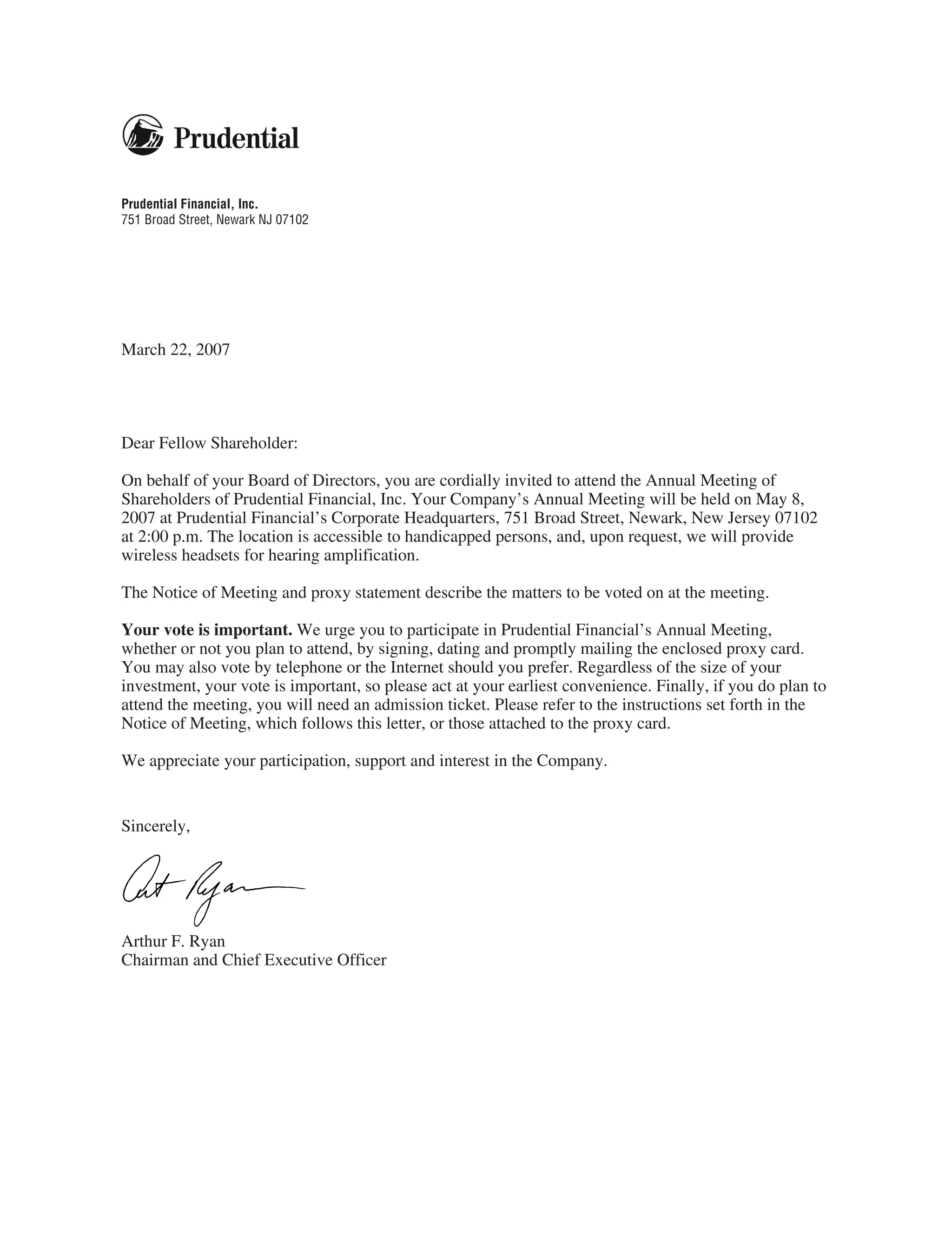 The document is a notice for the annual meeting of shareholders of Prudential Financial, Inc. to be held on May 8, 2007 at 2:00 pm at Prudential Financial's Corporate Headquarters in Newark, NJ. Shareholders will vote on two items of business - the election of 12 directors and the ratification of the appointment of PricewaterhouseCoopers LLP as the independent registered public accounting firm. Shareholders of record as of March 9, 2007 are entitled to vote. Instructions are provided for shareholders on how to vote, including by proxy, internet, telephone, or in person with proof of ownership and identification.
