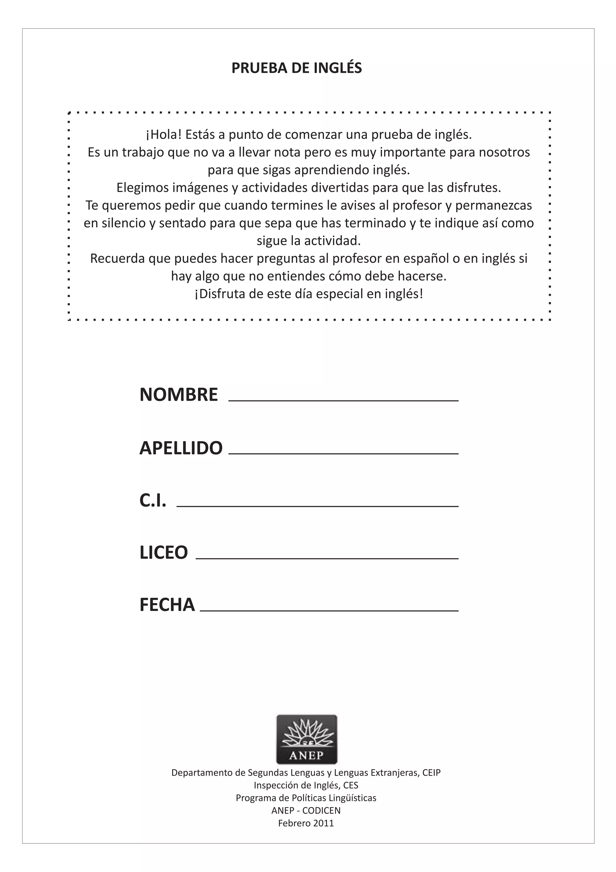 This document introduces an English language test for students, noting that it is not for a grade but is important for continuing to learn English. It encourages students to notify their teacher when finished and remain quiet, and says they can ask questions in English or Spanish if anything is unclear. Students are asked to enjoy this special day of practicing their English skills.
