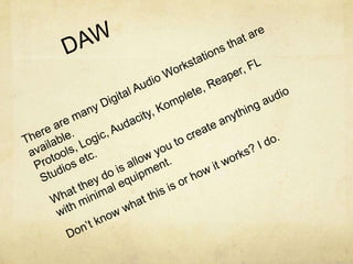 The document summarizes the author's experience with audio production over several stages of their life and education. As a high school sophomore, they began producing recordings for musician friends. By graduation, they had produced their best friend's metal band. They later attended Full Sail University to study music theory, audio science, and history. The author emphasizes their passion and ongoing learning process rather than credentials. They see music production not as a job but as a fun way to continue learning and making music.