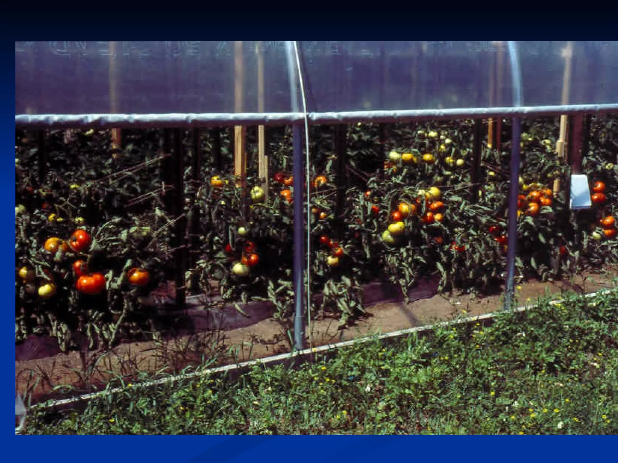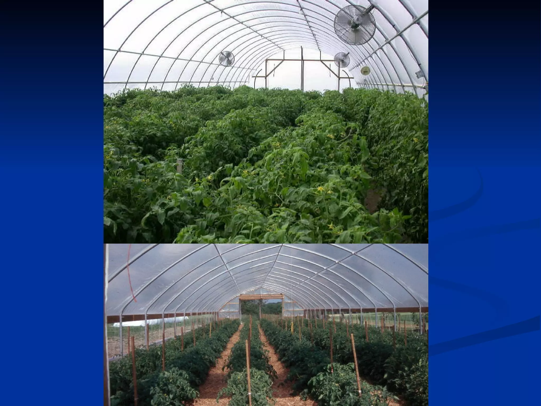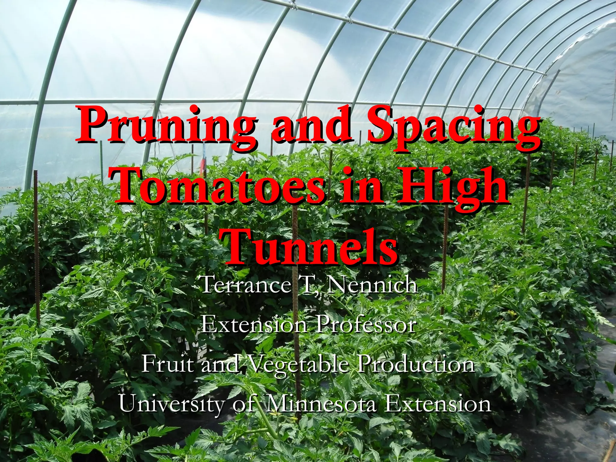The document discusses pruning and spacing techniques for tomatoes grown in high tunnels, finding that pruning to a single or double stem increases yield and fruit size for determinate varieties, while removing suckers increases and prolongs yield for indeterminate varieties. Closer plant spacing of 12-18 inches produced higher early and total yields compared to 24 inch spacing. Proper pruning and spacing techniques can optimize tomato production in high tunnel systems.