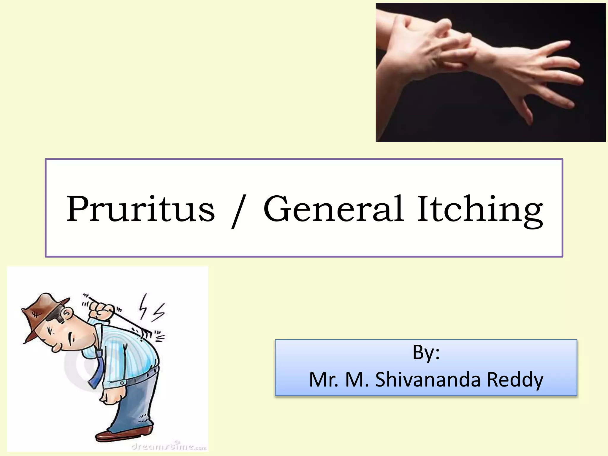 This document discusses pruritus (itching) by defining it, listing common causes such as dry skin, skin conditions, systemic diseases, nerve disorders, allergic reactions, drugs, and psychological factors. It describes the pathophysiology of the itch-scratch cycle and classification of pruritus. Diagnosis involves history, physical exam, and potential lab tests. Management includes topical corticosteroids, oral antihistamines, antidepressants, treating underlying causes, phototherapy, and nursing interventions like moisturizing and distraction techniques. Complications can be skin injury, infection, and scarring if scratching is not prevented.