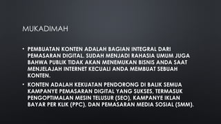 The document outlines the differences between copywriting and content writing within digital marketing, highlighting that content writing focuses on educating and entertaining readers, while copywriting aims to persuade and drive sales. Examples of content writing include articles, blog posts, and newsletters, whereas copywriting includes ads, slogans, and direct mail. The ultimate goals for each are distinct, with content writing fostering relationships and trust, and copywriting emphasizing immediate action and conversions.