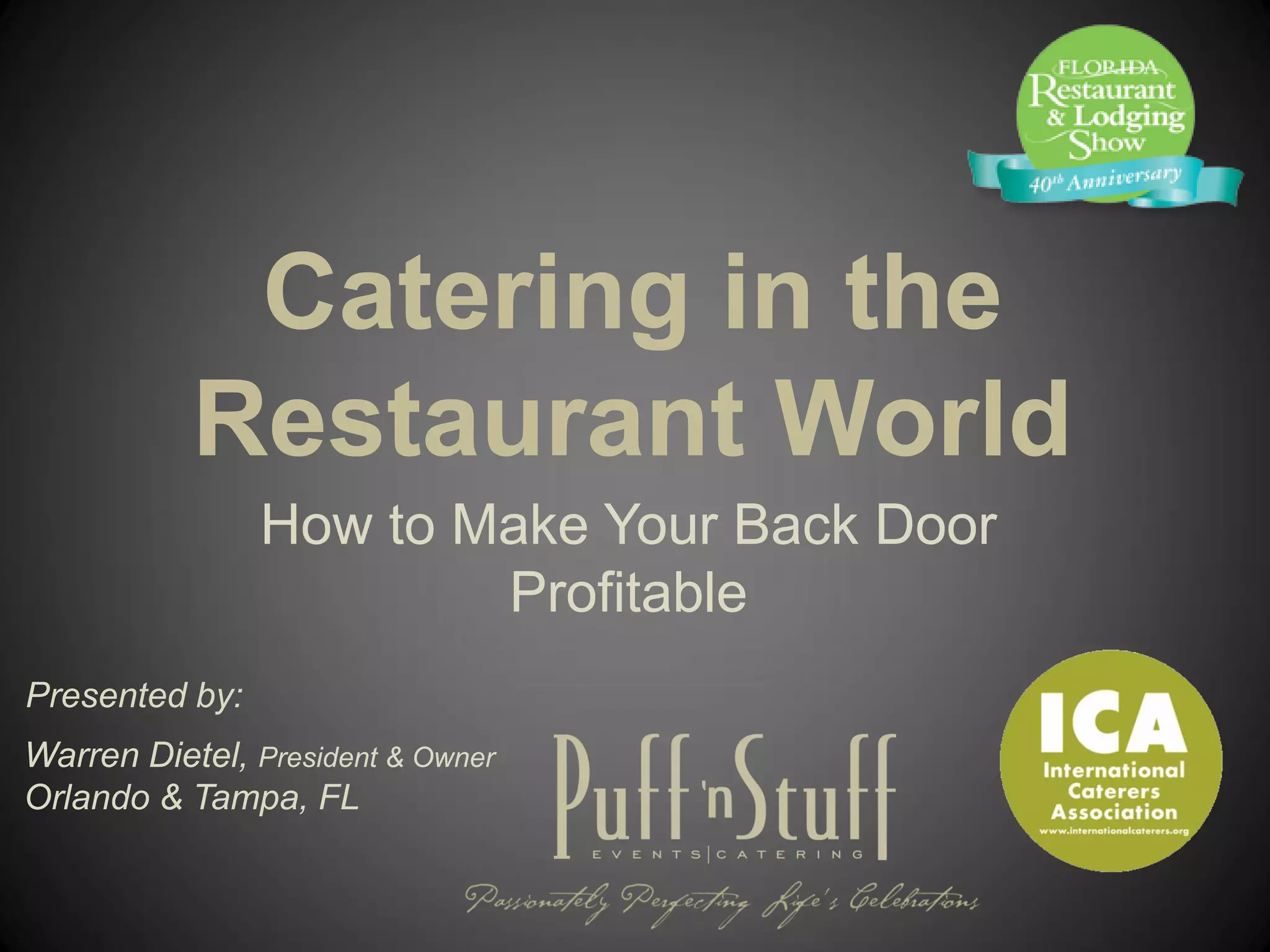 The document provides tips on how restaurants can profitably expand into off-site catering. It discusses marketing catering services to current and potential clients, handling the logistical challenges of off-site catering like transportation and equipment, and properly pricing catering proposals to account for additional expenses. The presentation is given by the owner of a large catering company who shares his experience growing the business through catering and advises restaurants on deciding if catering is right for them and how to structure pricing.