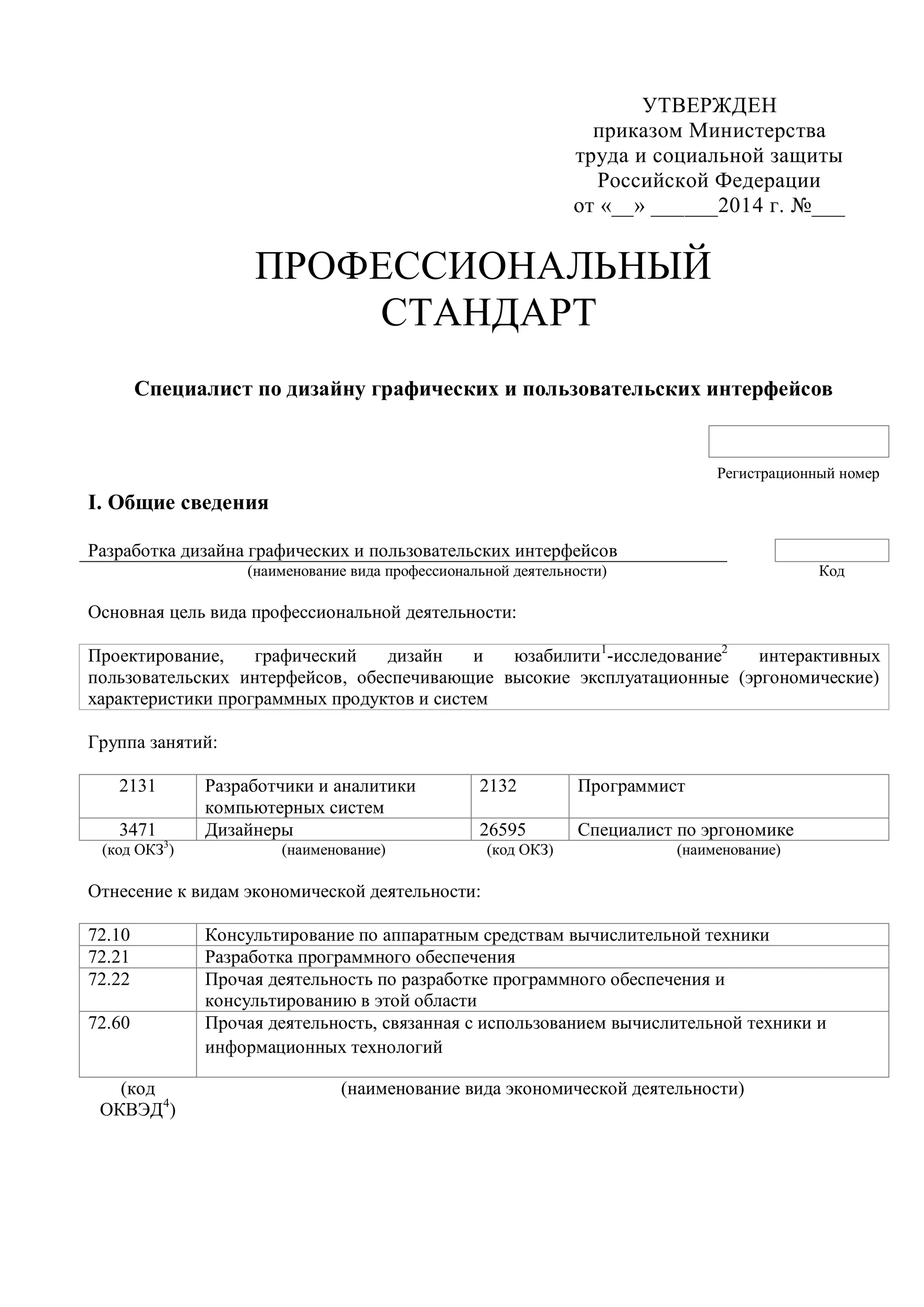 Документ описывает профессиональный стандарт для специалистов по дизайну графических и пользовательских интерфейсов в России, утвержденный Министерством труда и социальной защиты. Он включает обобщенные трудовые функции, требования к образованию, квалификации и опыту, а также основные направления деятельности, связанные с проектированием и анализом интерфейсов. Основной целью является создание эргономически эффективных программных продуктов и систем.