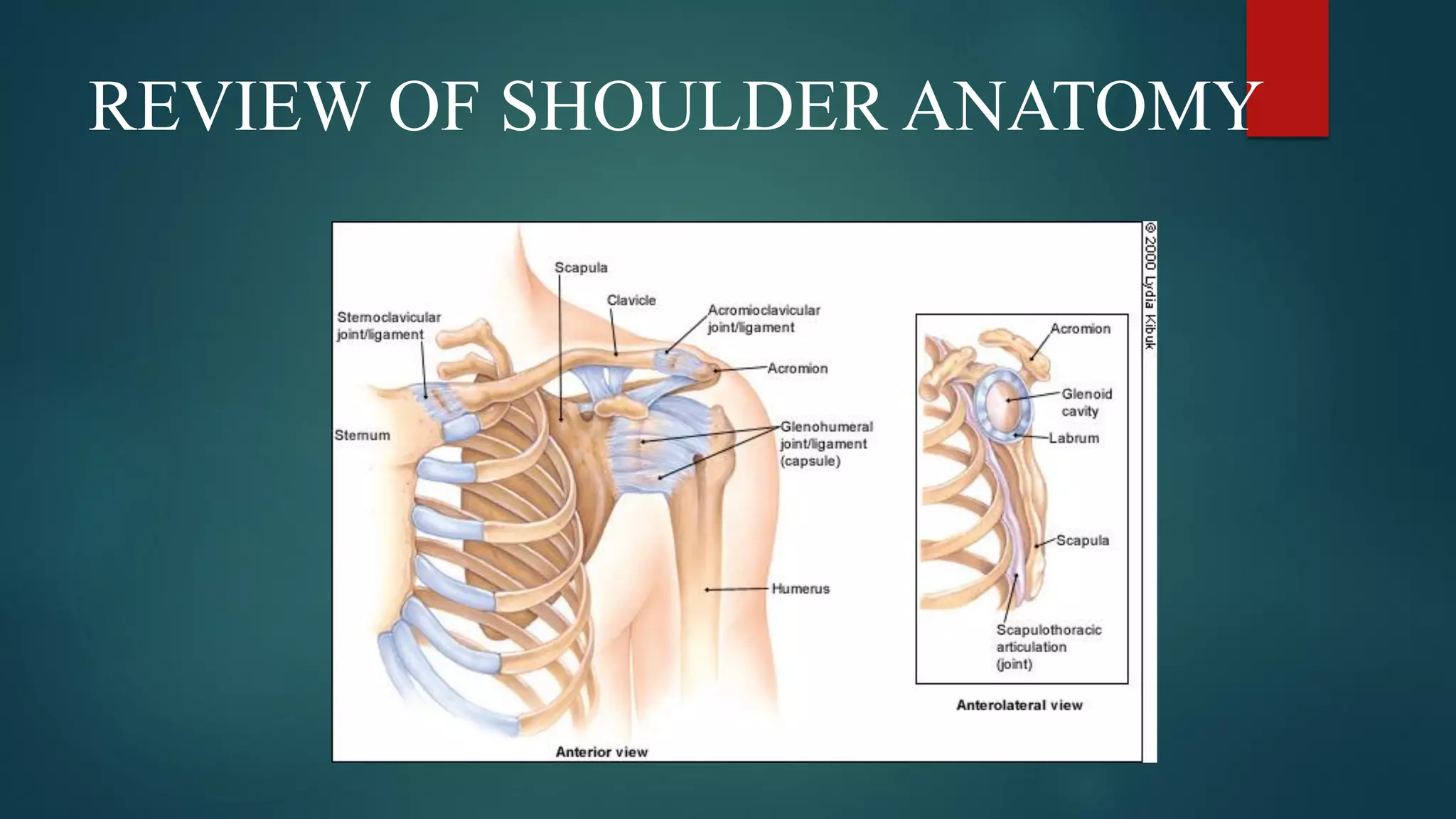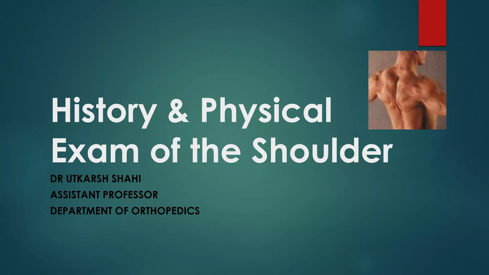 This document provides an overview of performing an exam of the shoulder. It reviews relevant anatomy including bones, joints, ligaments, muscles of the rotator cuff. It describes taking a history including questions about chief complaints, pain characteristics, instability, neurological symptoms, loss of function. The physical exam section reviews inspecting for deformities, palpating various structures, evaluating range of motion including forward flexion, abduction, and rotational movements. Special tests like the painful arc maneuver are also outlined. Differential diagnoses for common shoulder conditions are listed.
