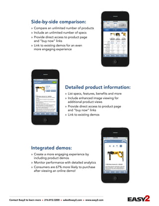 The document discusses the advantages of mobile product selectors for retailers, noting a 40% increase in conversions after consumers engage with them. It emphasizes the growing trend of mobile shopping, with consumers across all age groups increasingly using mobile devices to gather product information. Additionally, it highlights the features and benefits of specific products, encouraging retailers to use existing assets to enhance customer experiences.