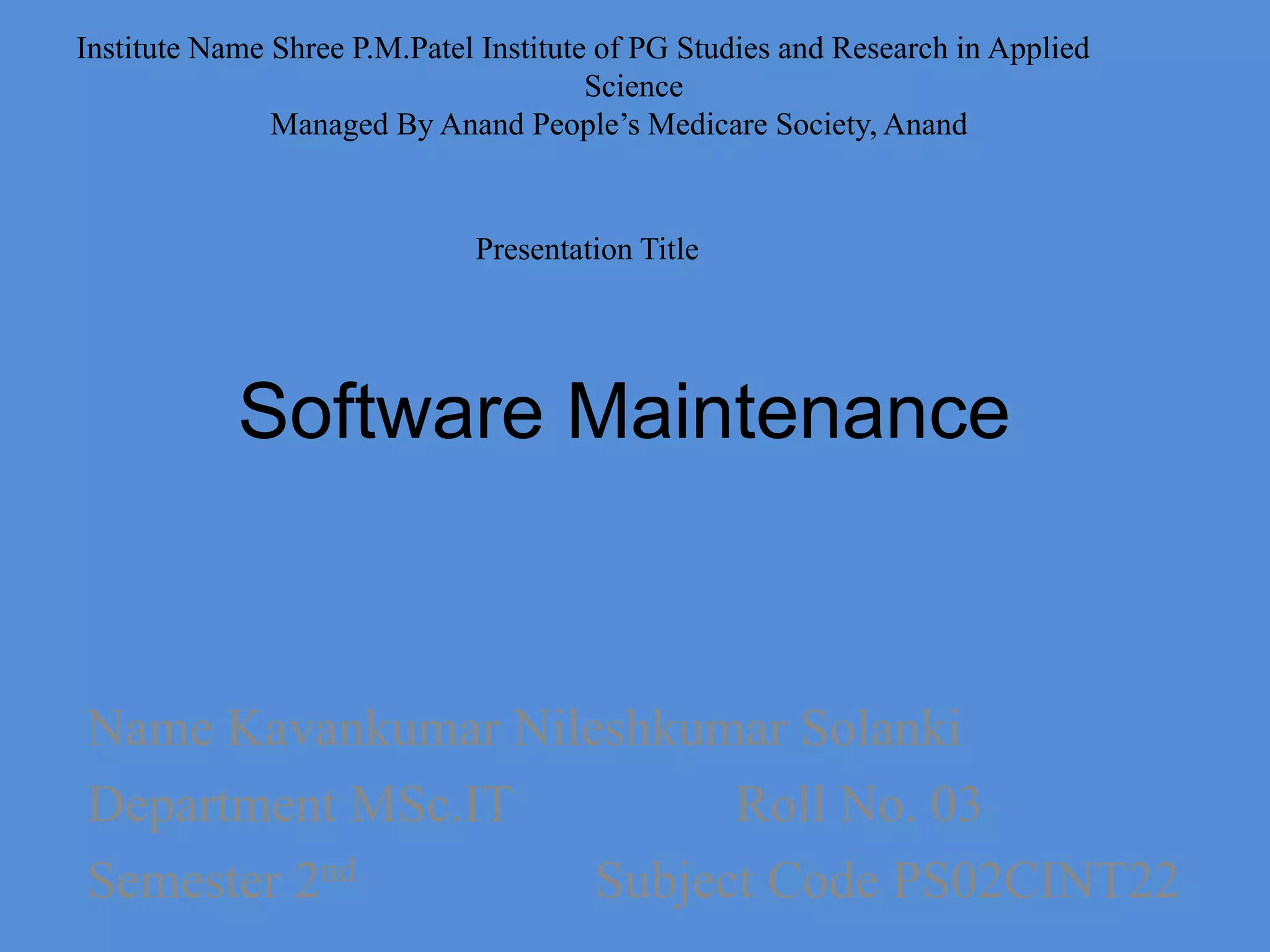 This document discusses software maintenance. It defines software maintenance as modifications made to a software system after delivery to correct faults, improve performance, or adapt to changes. The document outlines the objectives, introduction, definitions, reasons for maintaining software, advantages, laws of software evolution, types of maintenance (corrective, adaptive, perfective, preventative), software maintenance models (quick-fix, iterative enhancement, full-reuse, Yau and Collofello's model), standards, and bibliography.