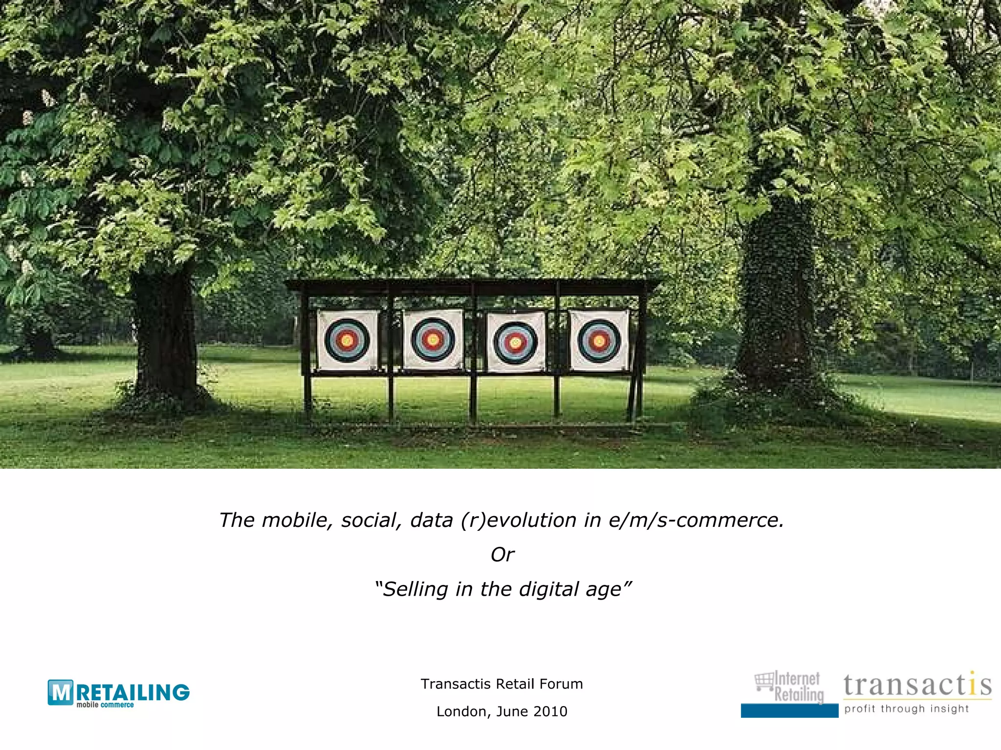 The document discusses the evolution of e/m/s-commerce and social commerce in the digital age. It notes that social media traffic now exceeds email traffic, with Facebook being a major source of traffic. Social networks allow for new forms of social commerce through user reviews, recommendations, and user-generated content. Mobile commerce is also growing rapidly, with many consumers actively using their mobile devices to research purchases and find promotional offers. The document advocates for a more contextual and modal approach to digital commerce that recognizes customers are no longer confined to computers and that information is ubiquitous.