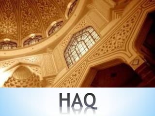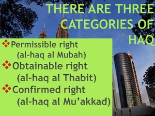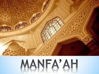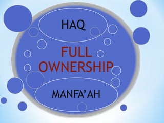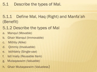 This document defines key Islamic legal concepts related to property (mal). It discusses the different definitions and classifications of mal, haq (right), and manfa'ah (benefit) according to the major Islamic schools of jurisprudence (Hanafi, Maliki, Shafiee, Hambali). It describes the types of mal as movable (manqul), immovable (ghair manqul), invaluable (qimmiy), and single-use (istihlakiy). Intellectual property and contracts involving manfa'ah such as borrowing, renting, and waqaf are also addressed. The major difference between haq mali and haqq ghair mali is that the