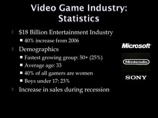 The gaming console market saw $18 billion in revenue in 2007, a 40% increase from 2006. The fastest growing demographic for gamers is those over 50 years old, making up 25% of the market. Nintendo Wii has sold 34 million units worldwide as of 2008, leading global sales. The Xbox 360 has sold over 22 million units globally but leads in European sales with 6 million units. The PlayStation 3 has sold 16.84 million units worldwide but leads in Japan with 7 million units sold.