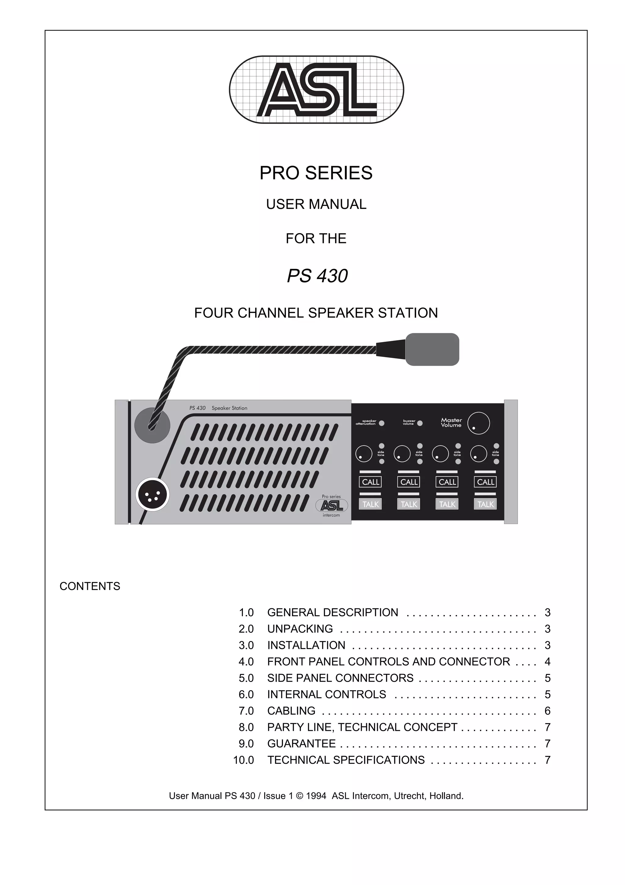 The document is a user manual for the PS 430 four channel speaker station. It provides instructions for unpacking, installing, and operating the device, including descriptions of front panel controls and connectors, side panel connectors, internal controls, cabling guidelines, and technical specifications. The PS 430 allows for four channel communication and includes features such as a gooseneck microphone, loudspeaker, volume controls, talk and call buttons, and a headset connector.