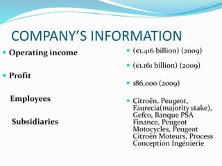 This document provides information on PSA Peugeot Citroen, a French multinational manufacturer of automobiles and motorcycles. It discusses the company's operating income, subsidiaries, website, headquarters, key people, products, revenue, number of employees, production facilities and capacity. The company aims to produce high quality vehicles efficiently while reducing environmental impact and improving customer service, mobility options, and its presence in key international markets like China. It has expanded production capacity in China through joint ventures and plans to become one of the major automakers in that market.