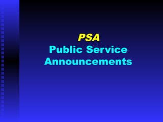 The document provides a comprehensive guide for creating public service announcements (PSAs), defining them as unpaid announcements that serve the public interest. It outlines the assignment of producing two 60-second PSAs on various topics, detailing the preproduction and production processes, including research, scripting, and recording. Examples of possible PSA topics include health issues, personal safety, and social concerns, with a strong emphasis on storytelling and factual information.