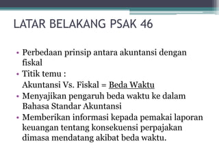 PSAK 46 membahas akuntansi pajak penghasilan. PSAK ini menjelaskan perbedaan antara akuntansi dan perpajakan dalam hal waktu pengakuan pendapatan dan beban, serta menyajikan pengaruh beda waktu tersebut dalam laporan keuangan berdasarkan standar akuntansi."