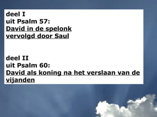 deel I uit Psalm 57: David in de spelonk vervolgd door Saul deel II uit Psalm 60: David als koning na het verslaan van de vijanden