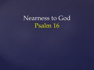 1. The document analyzes Psalm 16 and discusses how to develop a sense of nearness to God. It outlines five key points: recognize dependence on God, declare allegiance to God alone, express thankfulness to God, develop awareness of God through study, reflection and prayer, and enjoy the confidence that comes from God.