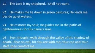 Psalm 23 describes God as a shepherd who provides for and protects his flock. The psalmist expresses confidence that even in the face of danger or adversity, God is present to restore, guide, and comfort. The psalm concludes by declaring that God's goodness and love will forever be with those who dwell in his house.