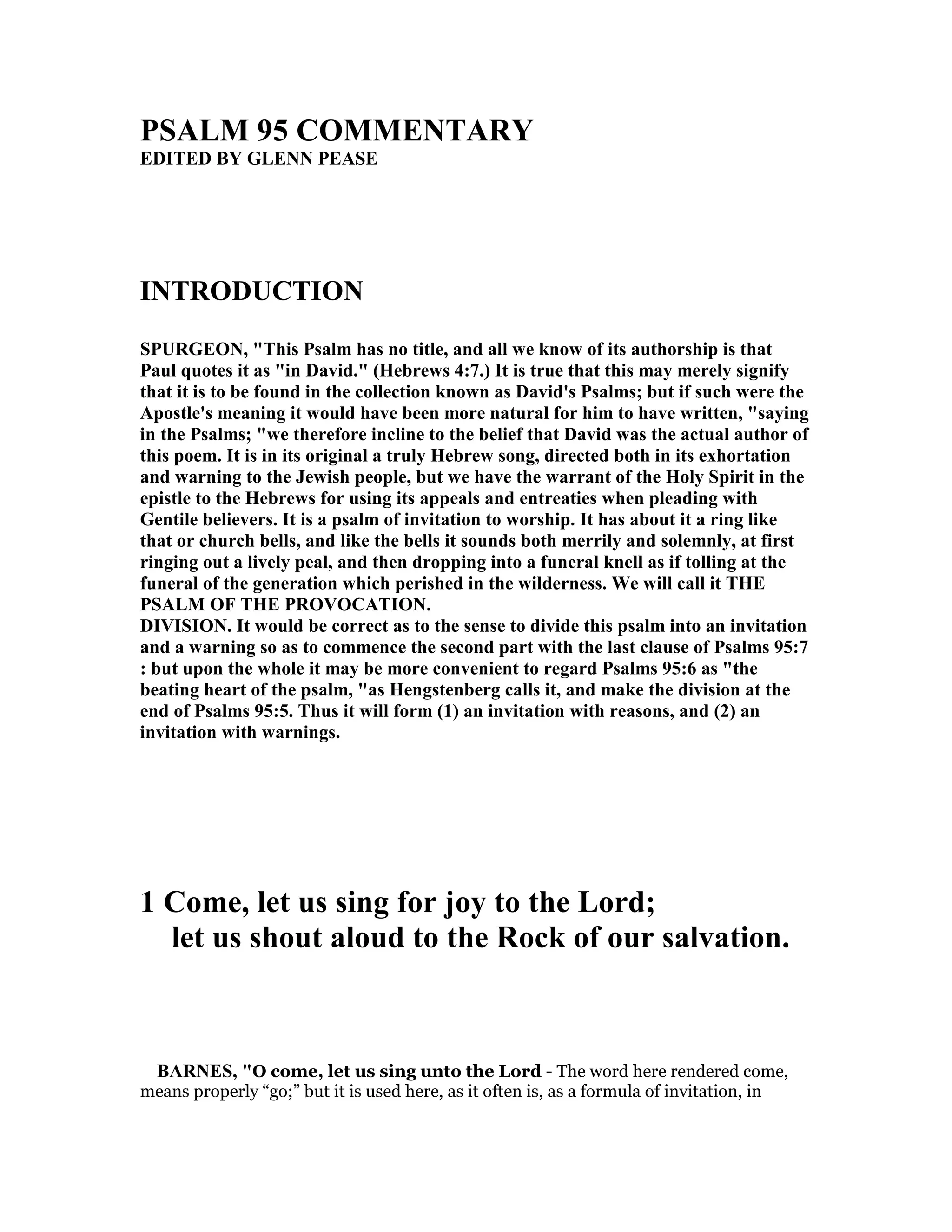 Psalm 95 is believed to be authored by David and serves as an invitation for worship, blending joy and solemnity in its call to praise God, referred to as the 'rock of our salvation.' The psalm emphasizes communal worship, urging believers to express heartfelt gratitude and reverence towards God, while also warning against neglecting His service. It encapsulates themes of joy, unity in praise, and the need for humility in worship.