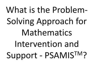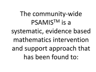 The PSAMISTM is a systematic, evidence-based mathematics intervention approach designed to enhance math performance among learners while addressing inequalities and improving community involvement in education. It encourages ethical behavior and creativity, promoting a collaborative environment among learners, teachers, and community members to foster positive attitudes towards mathematics. The methodology is rooted in George Polya's framework for problem-solving, emphasizing proactive and ethical approaches to learning and teaching math.