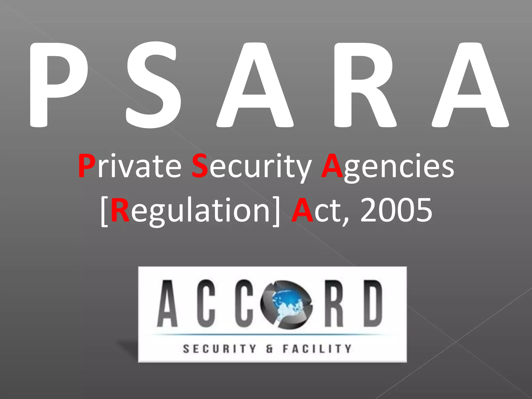 The document outlines the duties, eligibility requirements, and training standards for private security guards and supervisors in India according to the Private Security Agencies (Regulation) Act of 2005. It states that the duties of security guards include providing security to persons and property, assisting police investigations, and reporting any noticed legal violations. It also requires that agencies hire supervisors, provide training, and issue photo IDs to guards. Guards must be Indian citizens between 18-65 years old, pass a background check and medical exam, and complete mandatory training.