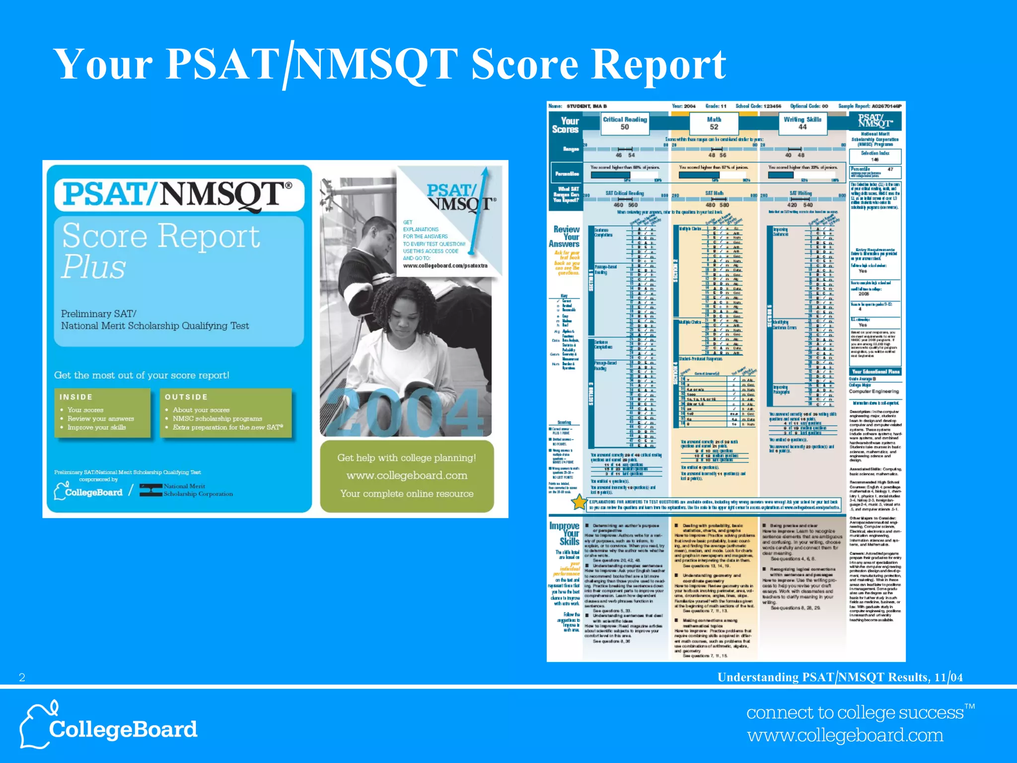 The PSAT/NMSQT, co-sponsored by the College Board and the National Merit Scholarship Corporation, provides students with a color-coded score report for critical reading, math, and writing skills, enabling comparison among peers based on their grade level. Students receive a test booklet with their score report to review answers and can access free explanations online for any incorrect answers. The report also includes suggestions for skill improvement and information on college majors based on the student's interests.