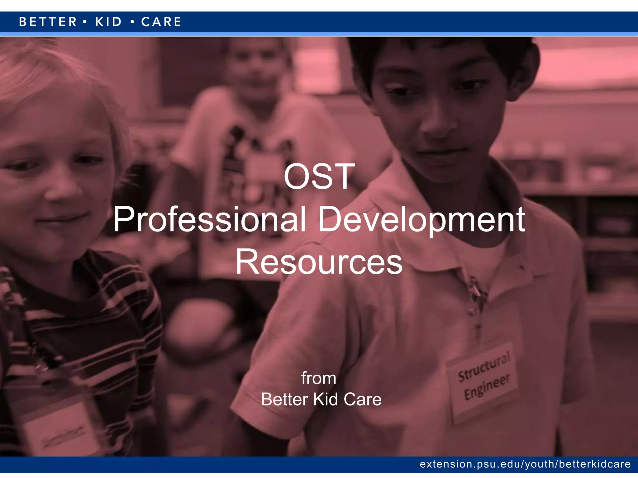 The document outlines professional development resources for youth development practitioners provided by Better Kid Care, including a new staff orientation program, a series of on-demand modules, and various lesson series. It emphasizes positive youth development, cultural competency, and offers credits for completion, with a focus on enhancing skills across multiple domains. Additionally, it highlights the Click2Science initiative, which aims to build STEM facilitation skills through training and resources.