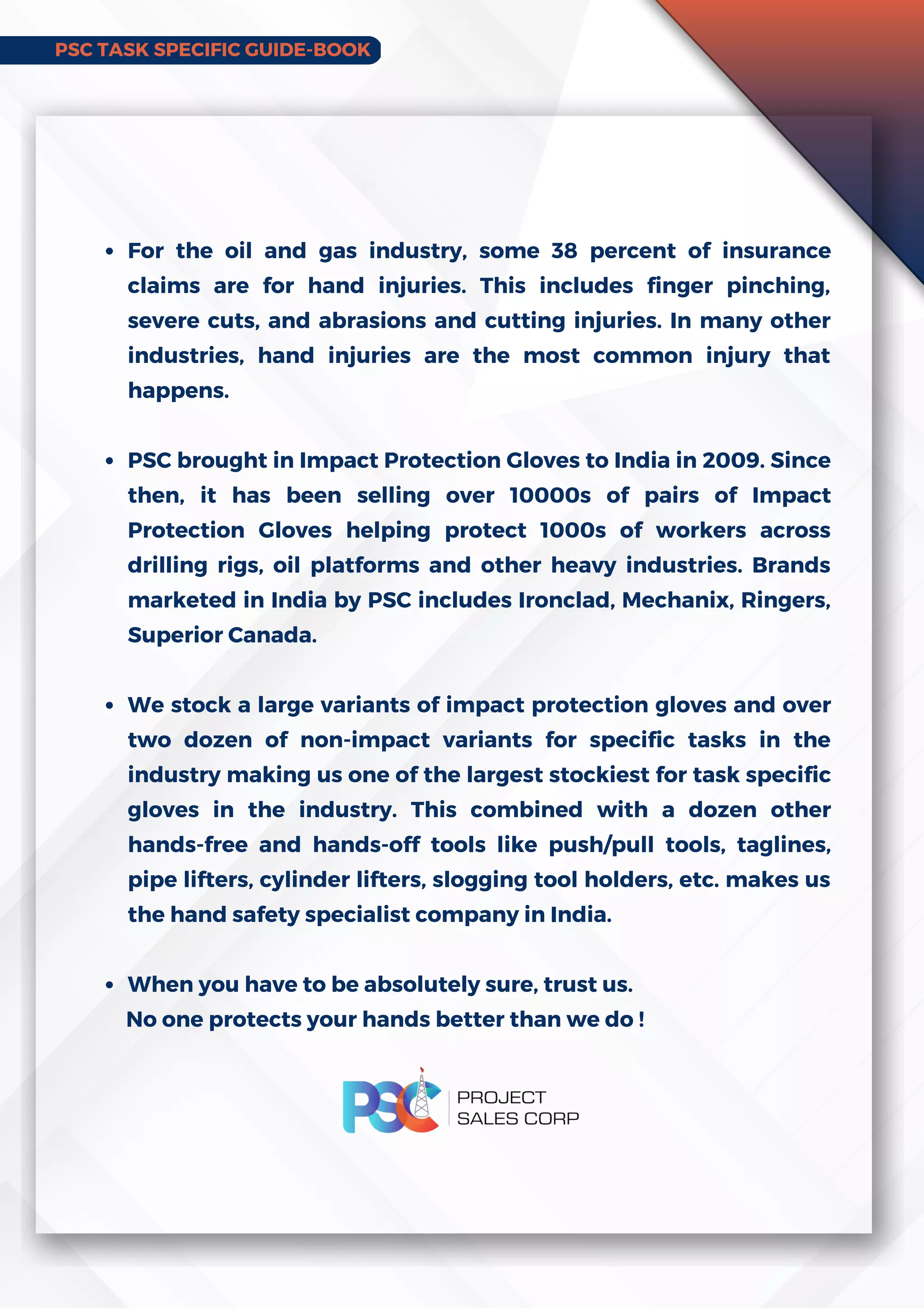 - PSC is a hand safety specialist company in India that stocks over two dozen variants of impact protection and non-impact gloves for tasks in industries like oil and gas.