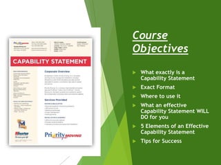 This document provides an overview of how to write an effective capability statement. It defines a capability statement as a promotional statement about a business's capabilities and skills. It recommends a 1-2 page format and outlines 5 key elements to include: 1) core competencies, 2) differentiators, 3) past performance, 4) company data, and 5) contact information. The document emphasizes tailoring the capability statement to the specific needs and terminology of the target audience in order to build relationships, qualify for opportunities, and set the business apart from competitors.