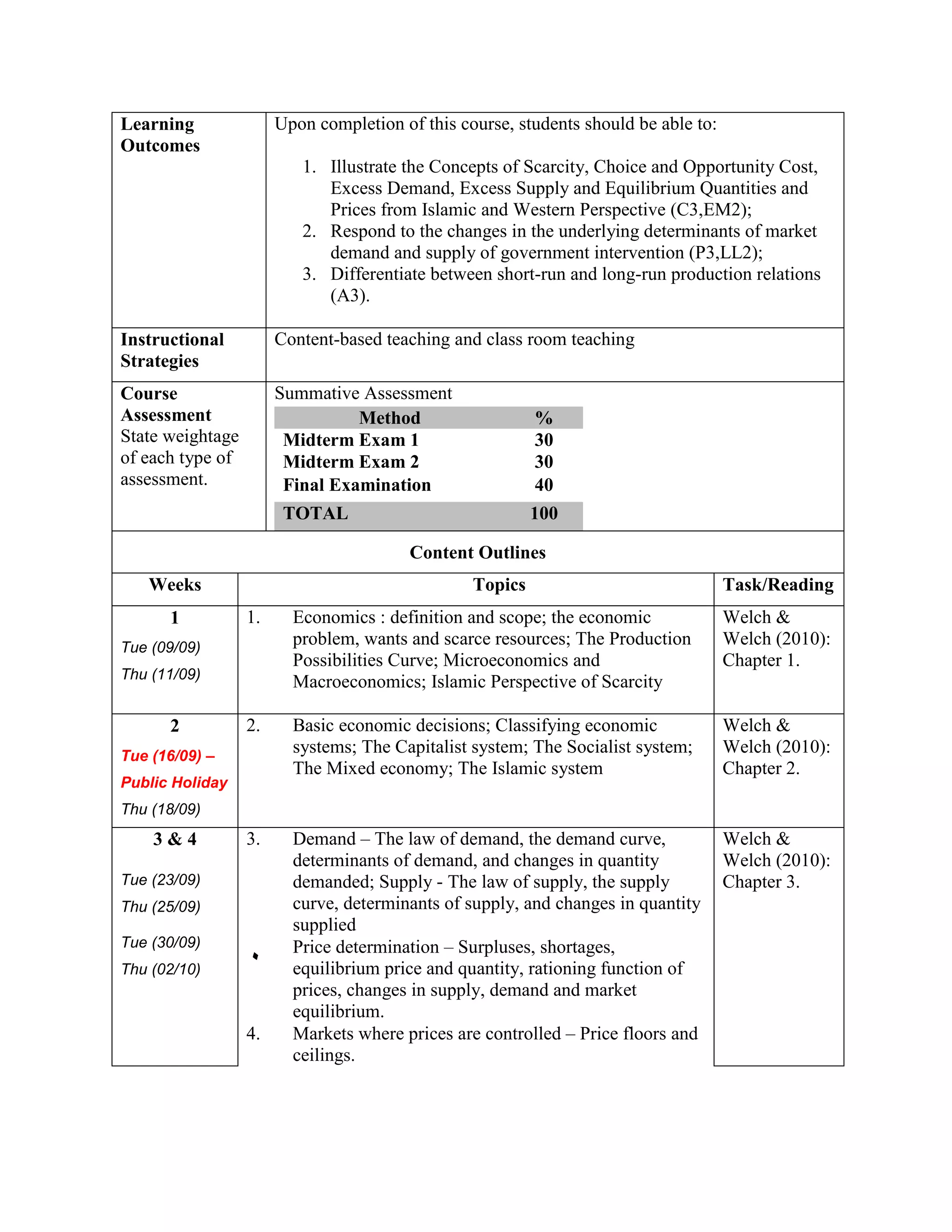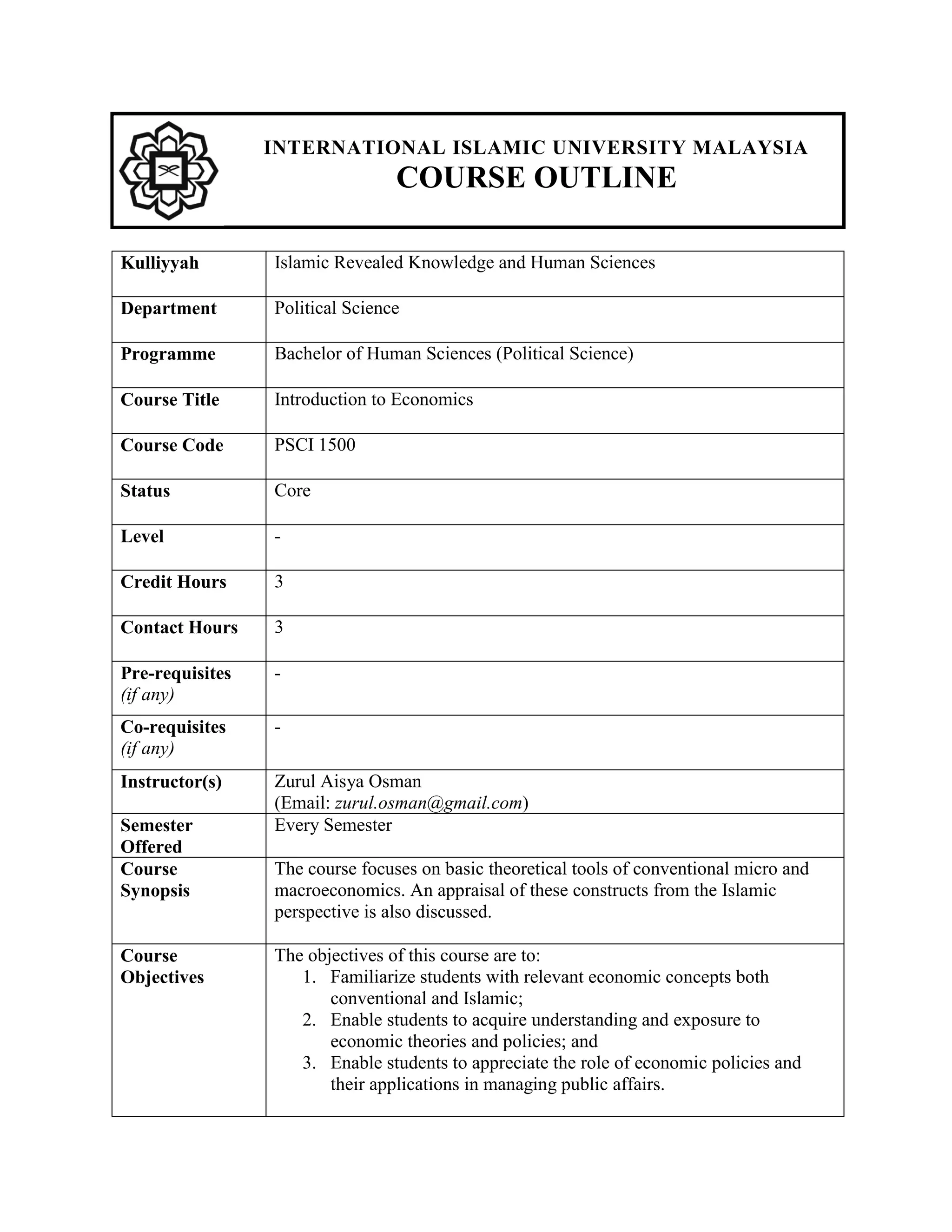 This document outlines a course on Introduction to Economics offered at the International Islamic University Malaysia. The 3-credit, 3-hour course is offered every semester to political science students. It introduces both conventional and Islamic perspectives on microeconomic and macroeconomic concepts. Topics include scarcity, production possibilities, demand and supply, market structures, unemployment, inflation, economic growth, fiscal and monetary policy. Assessment includes two midterm exams and a final exam. The course aims to familiarize students with relevant economic theories and enable them to apply economic policies through an Islamic lens.