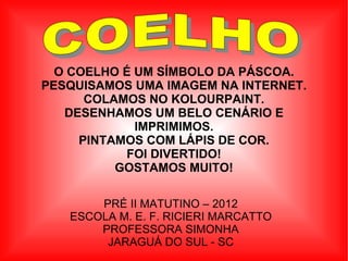 A class of young students created an Easter-themed art project involving drawing a rabbit symbol of Easter. They found an image of a rabbit online, pasted it into a painting program to create a scenic background, printed and colored the picture with crayons, and enjoyed the fun activity, saying they liked it a lot. The document provides details of the art project created by a second grade morning class in 2012 at a school in Jaraguá do Sul, Santa Catarina, Brazil.