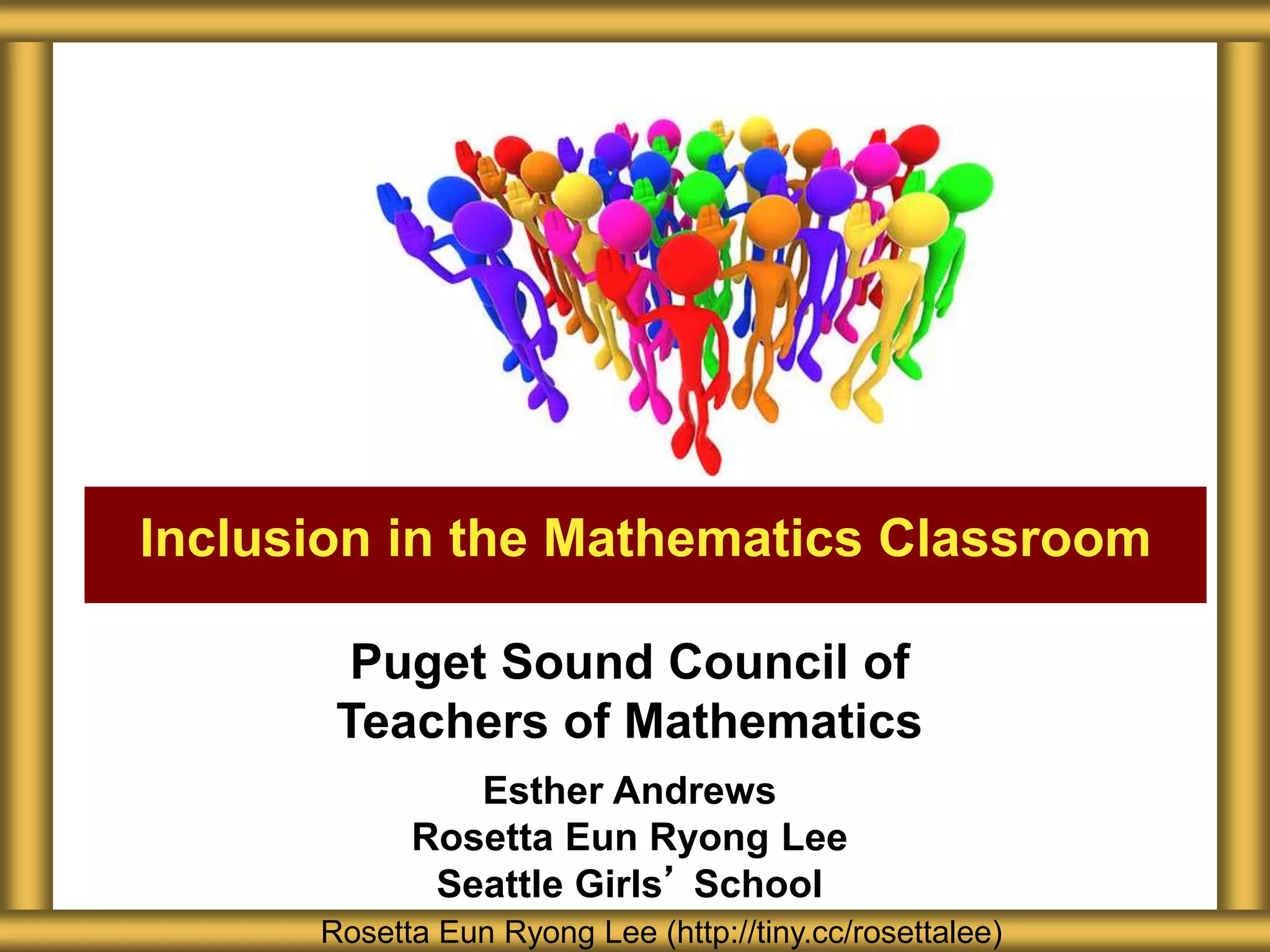 The document discusses the importance of inclusion in mathematics education at the Seattle Girls' School, addressing issues such as internalized oppression and stereotype threat. It outlines strategies to increase trust and flexibility in classrooms, emphasizing student choice, fair assessments, and creating a safe environment for learning. The document also calls for reflection on teaching practices to ensure diverse representations and equitable treatment of all students.