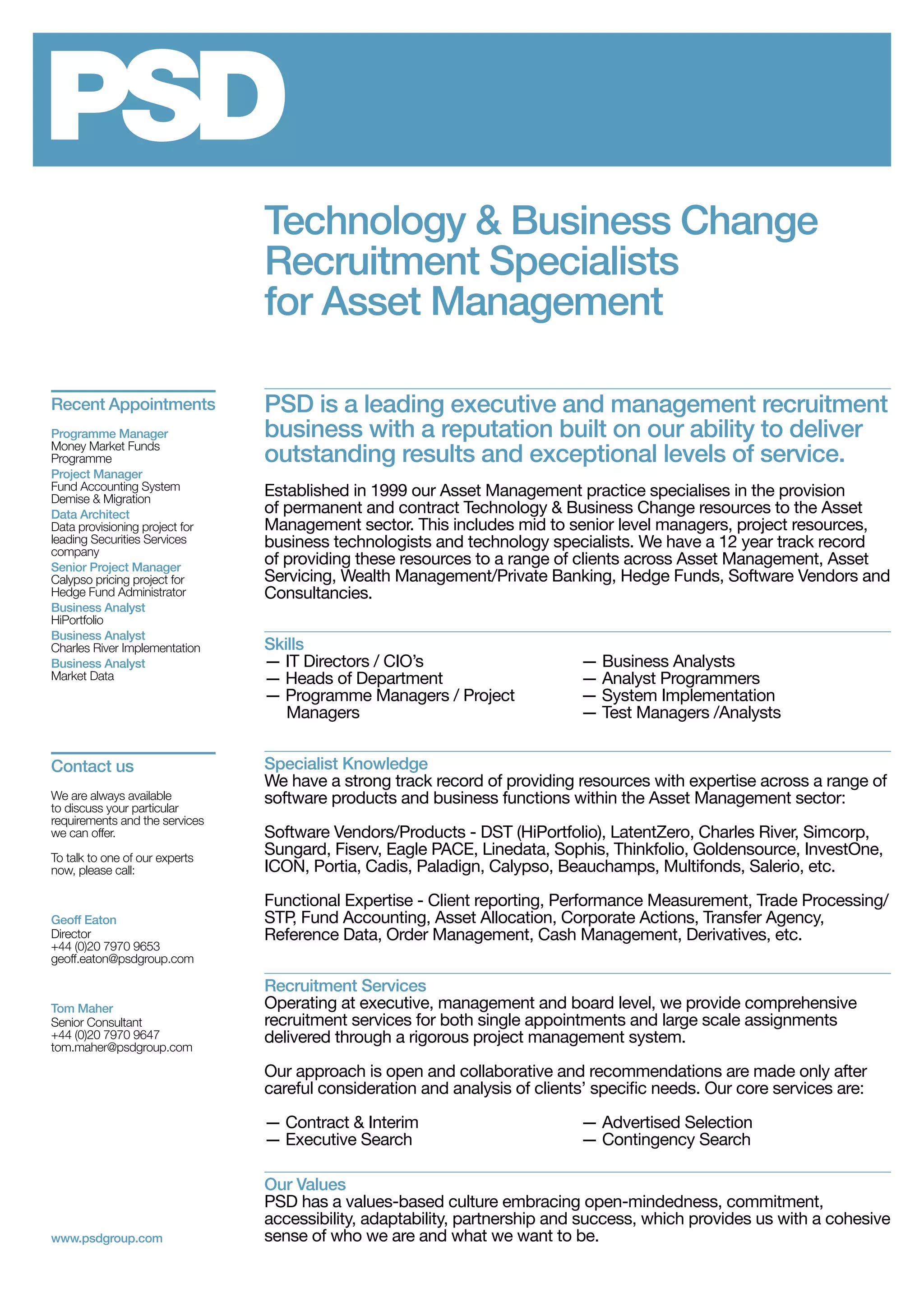 PSD is a leading recruitment firm that specializes in providing permanent and contract technology and business change resources to the asset management sector, including mid to senior level managers, project resources, business technologists, and technology specialists. They have 12 years of experience working with asset management, asset servicing, wealth management, hedge funds, software vendors, and consultancies. They recruit for positions including IT directors, heads of departments, programme managers, business analysts, and specialists with expertise in software products like DST, Charles River, and Simcorp as well as functional areas including client reporting, performance measurement, and trade processing. PSD offers comprehensive recruitment services including executive search, contract/interim placements, and advertised selection through a rigorous project