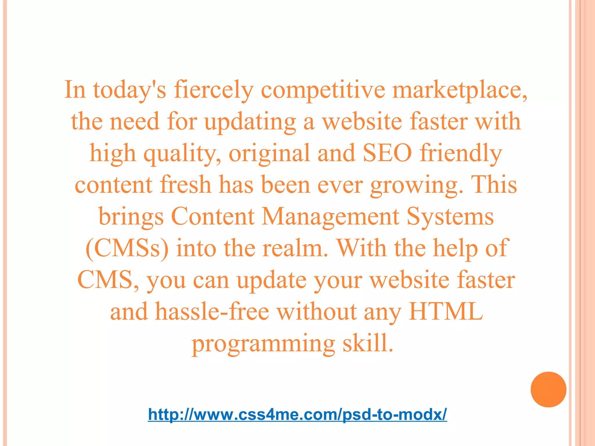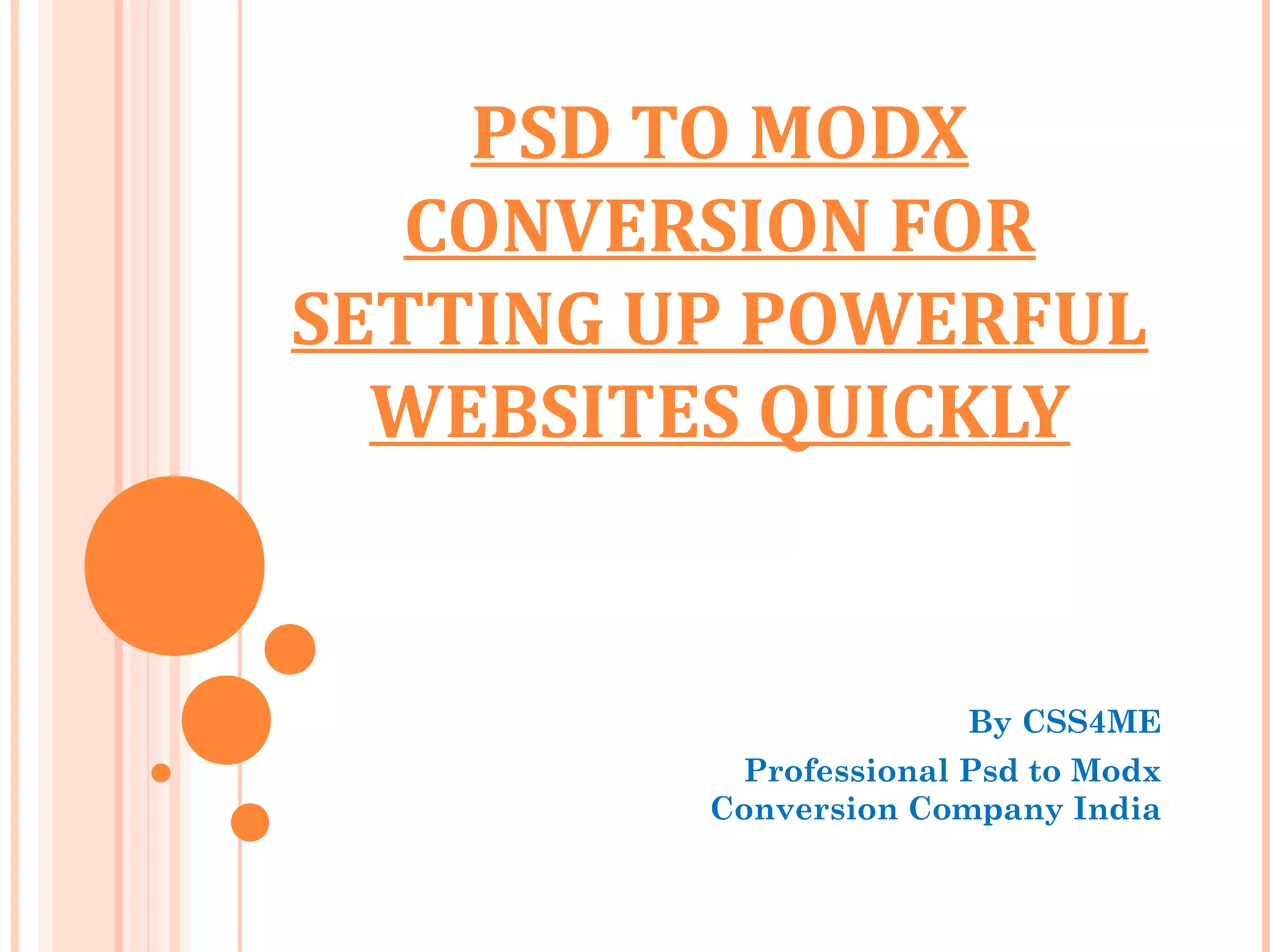 This document discusses converting Photoshop designs (PSDs) into templates for the MODX content management system (CMS). MODX allows creating and managing website content without HTML skills. The conversion process involves slicing a PSD into HTML/CSS code and integrating it as a MODX template for building MODX sites. Hiring experts can provide pixel-perfect PSD to MODX conversions and custom MODX development services.