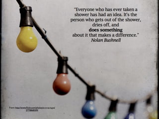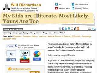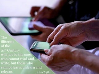 The document discusses a vision for innovative teaching and learning focused on collaboration, creativity, and lifelong learning. It emphasizes the importance of turning novice learners into expert learners who know how to learn strategically. It also discusses the need to teach students to respect the past but live in the future, and that educators must train themselves for the 21st century. Emerging technologies like cloud computing, mobile devices, and game-based learning are transforming education. Digital literacy now involves skills like design, sharing, analyzing information, and digital citizenship. Connected learning through networks allows individuals and educators to get smarter by learning from each other.