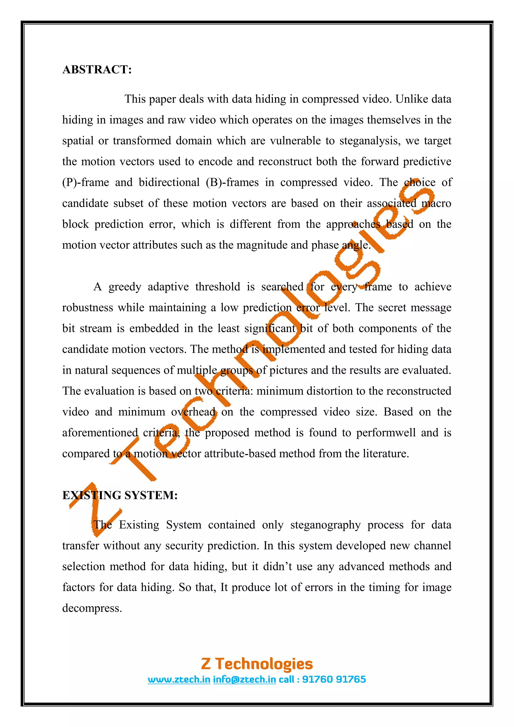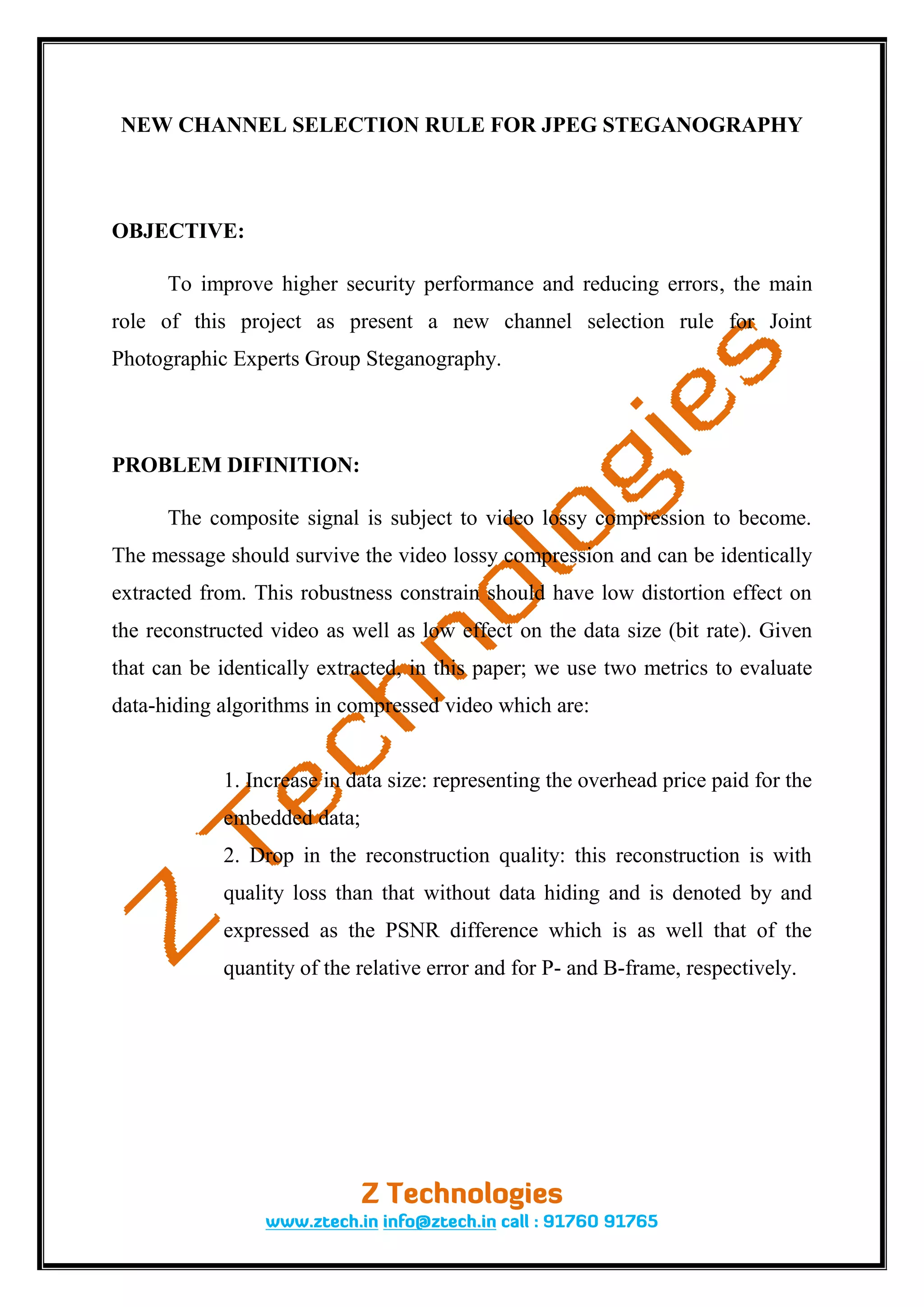 The document presents a new channel selection rule for JPEG steganography aimed at enhancing security and reducing errors during data hiding in compressed video. It evaluates the performance of data-hiding algorithms based on metrics such as data size overhead and reconstruction quality, and proposes a method that minimizes distortion and improves security using least significant bit (LSB) embedding and advanced encryption standards (AES). The proposed system overcomes the limitations of existing systems by utilizing advanced techniques to reduce compression errors and enhance robustness.