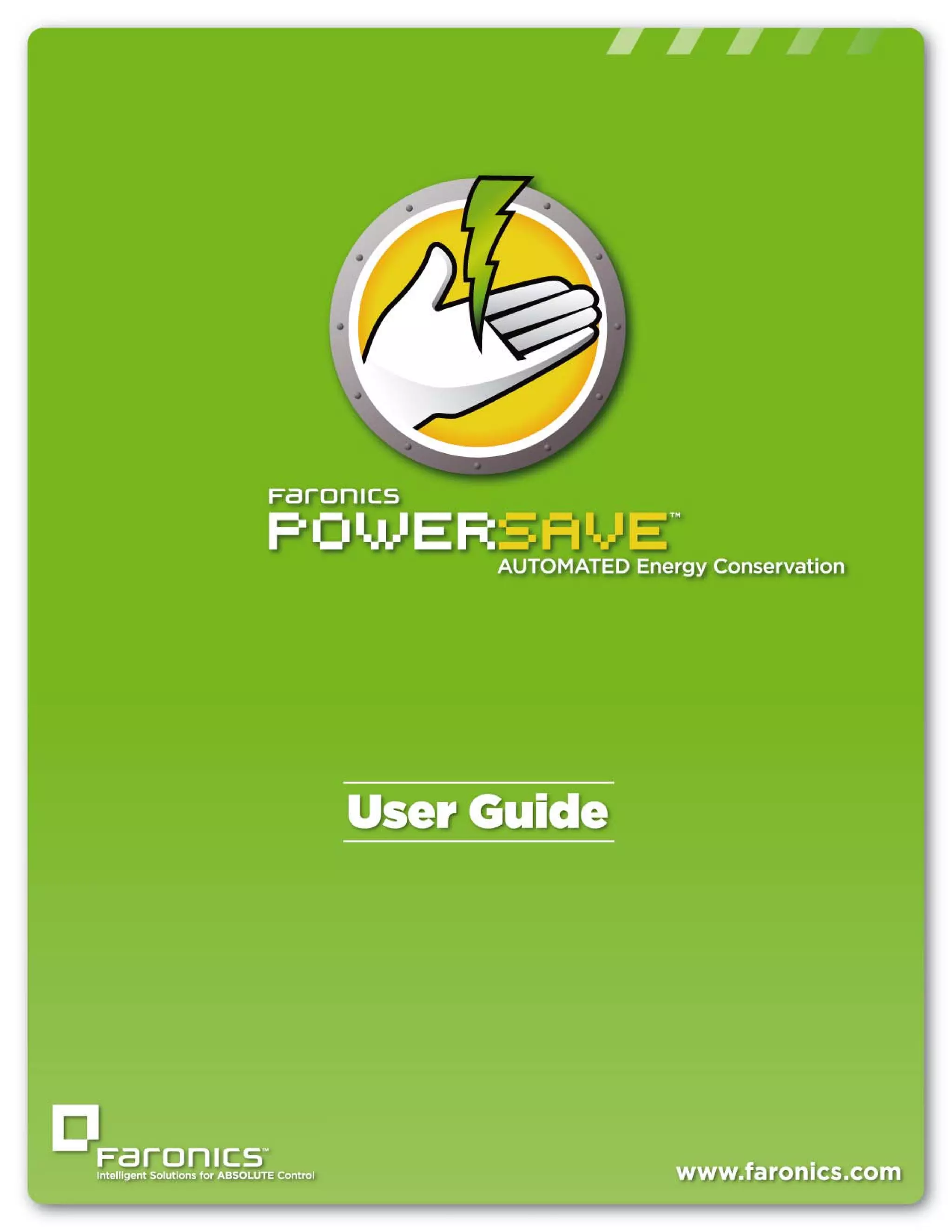 This document is a user guide for Faronics Power Save that describes how to install, configure, access and generate reports from the software. It provides information on system requirements, an overview of installation and configuration options using the Faronics Core Console interface or manually on a workstation, how to create and apply power plans and policies, and descriptions of various report types that can be generated.