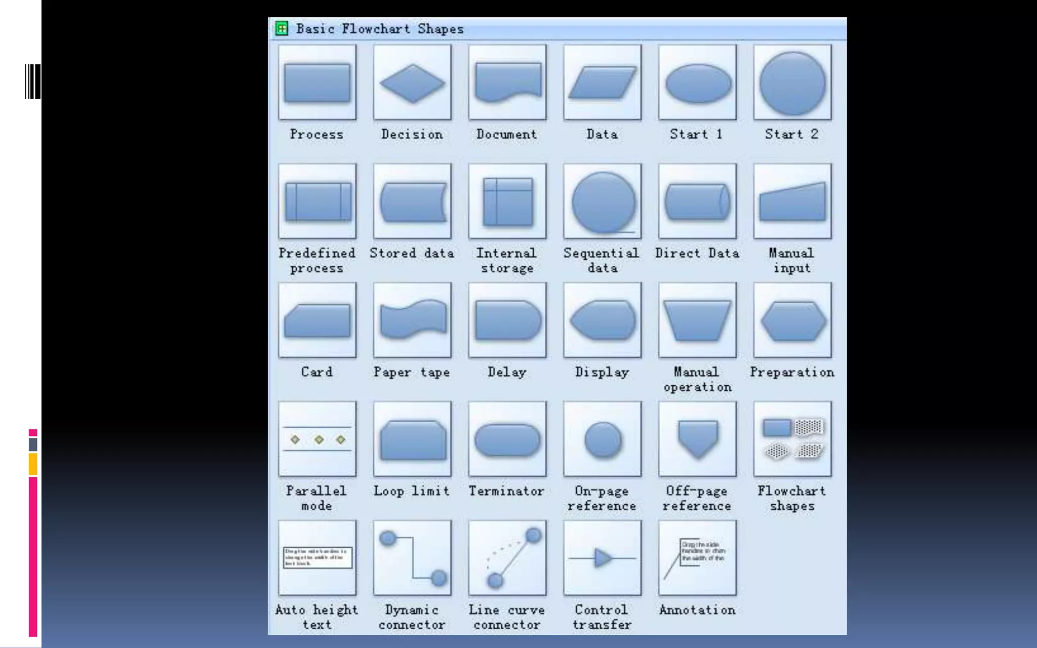 GUIDELINES FOR DRAWINGA FLOWCHARTFlowcharts are usually drawn using some standard symbols; however, some special symbols can also be developed when required.Start or end of the programComputational steps or processing function of a programInput or output operationDecision making and branchingConnector or joining of two parts of programMagnetic TapeOff-page connectorFlow lineAnnotationDisplay