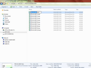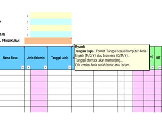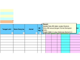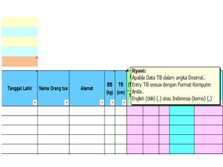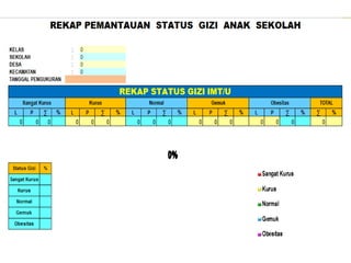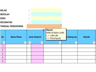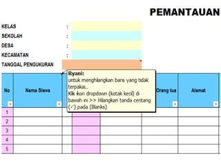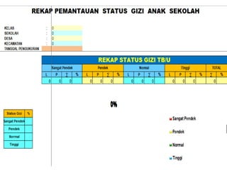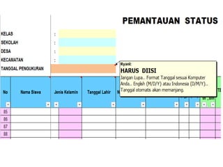 Dokumen ini memberikan instruksi penggunaan aplikasi pemantauan status gizi anak sekolah (PSG AS) tahun 2017 yang menggunakan dua indikator, yaitu indeks massa tubuh berdasarkan umur (IMT/U) dan tinggi badan berdasarkan umur (TB/U). Aplikasi ini mudah digunakan hanya dengan mengisi data anak di lembar excel yang disediakan.