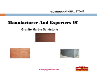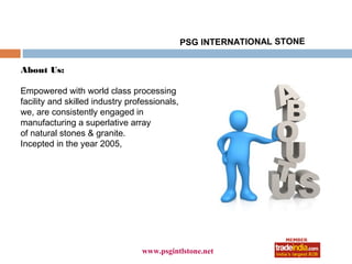 PSG International Stone is a manufacturer and exporter of granite, marble, and sandstone established in 2005. They have a world-class processing facility and skilled professionals who produce high quality natural stones. Their products include Absolute Black Granite, Marble, Kashmir Gold Granite, Rosy pink Granite, Black Galaxy Granites, and Blue Pearl Granite. They offer industry leading prices, ethical practices, quality assurance, and timely delivery.