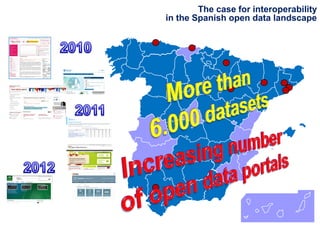 The document summarizes Spain's efforts to promote interoperability of public sector information through open data strategies and standards. Key elements include Royal Decree 1495/2011, which established a standard open data license and required all public sector information be reusable. Interoperability guidelines specify how to select, identify, describe, format, publish and catalog public sector datasets using standards like DCAT to ensure interoperability across systems. The guidelines comprise Spain's national interoperability framework for eGovernment strategies under Ley 11/2007.