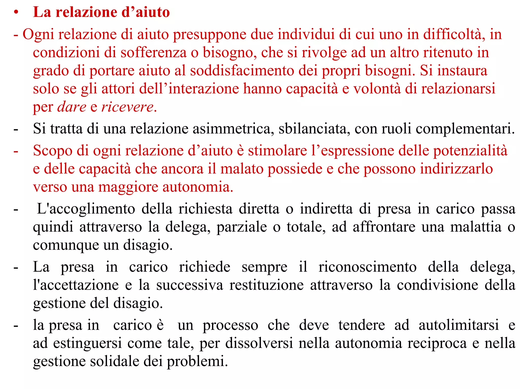 La relazione d’aiuto è un'interazione asimmetrica tra chi ha bisogno e chi offre supporto, mirata a stimolare l'autonomia del malato attraverso un processo di presa in carico e gestione condivisa del disagio. Lo stress, definito come un insieme di processi di adattamento a cambiamenti ambientali, influisce sulla salute fisica e mentale, spesso con conseguenze psicosomatiche, e il sostegno sociale rappresenta un fattore protettivo significativo nei confronti dello stress. La capacità di controllare la propria risposta allo stress può ridurre le reazioni negative e migliorare la salute complessiva.