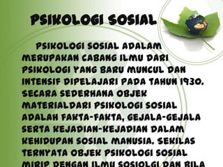 Dokumen ini membahas psikologi sosial sebagai cabang ilmu yang muncul pada tahun 1930, dengan fokus pada fakta-fakta dan kejadian dalam kehidupan sosial manusia. Terdapat berbagai pendekatan dalam psikologi sosial, termasuk perilaku, kognitif, psikoanalisa, dan fenomenologi, yang mengkaji tingkah laku individu beserta pengaruh sosialnya. Selain itu, dokumen ini menjelaskan keterkaitan psikologi sosial dengan bidang lain seperti psikologi perkembangan dan kepribadian.
